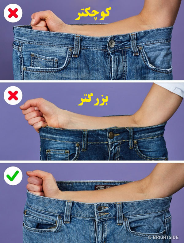 دست مشت شده خود را از پاچه شلوار رد کنید. شلواری اندازه شما است که مشت تان راحت از آن خارج شود.